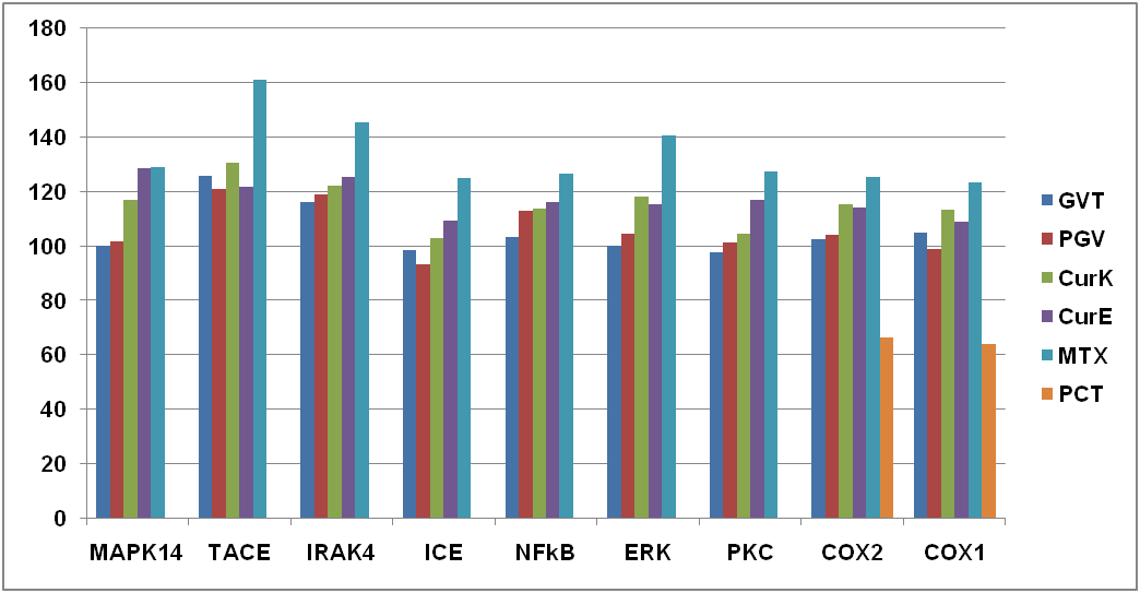 Conclusion: GVT-0 as a curcumin derivate possessed the best inhibitory activity against TNF-α converting enzyme and IL-1β converting enzyme which are the main route of inflammatory mediators in rheumatoid arthritis. In addition, GVT-0 influences less in metabolism of CYP450 enzymes, and has low toxicity.