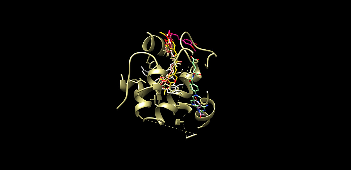 Fig. 6: Docking visualization of curcumin compound and its derivates on the target protein (created using chimera)