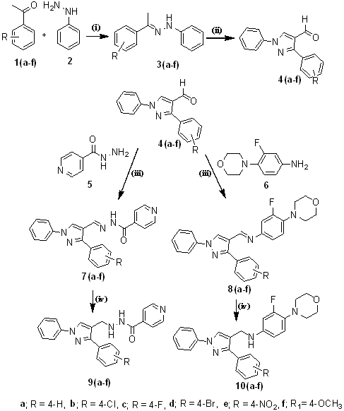The pyrazolyl derivatives 9(a-f) and 10(a-f) were synthesized as presented in Scheme 1. Initially, 3-aryl-1-phenylpyrazole-4-carbaldehydes 4(a-f) were synthesized from phenylhydrazones 3(a-f) by Vilsmeier-Haack formylation as reported by Raquib Alam et al. [20]. Then 3-aryl-1-phenylpyrazole-4-carbaldehydes 4(a-f) were condensed with isoniazid 5 and 3-fluoro-4-morpholinoaniline 6 which gives corresponding imines 7(a-f) and 8(a-f) respectively. The last step involves reduction amination of imines 7(a-f) and 8(a-f) using sodium borohydride (NaBH4) in methanol to afford corresponding titled compounds 9(a-f) and 10(a-f).