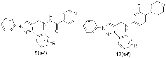 General procedure for synthesis of N'-((3-(4-substituted phenyl)-1-phenyl-1H-pyrazol-4-yl) methyl) isonicotino-hydrazide 9(a-f) and N-((3-(4-substitutedphenyl)-1-phenyl-1H-pyrazol-4-yl) methyl)-3-fluoro-4-morpholinoaniline 10(a-f)