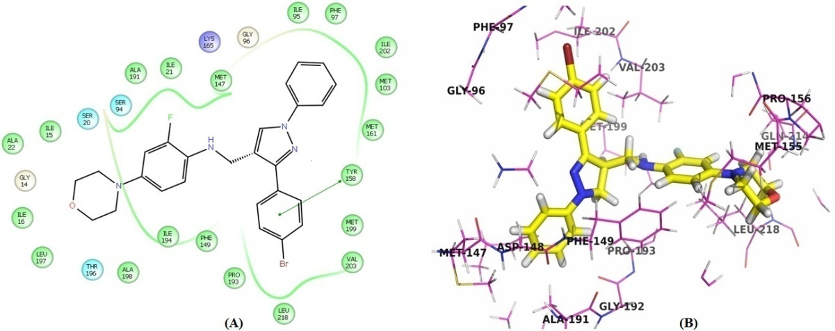 Fig. 2: (A) 2D docking pose of compound 10d; (B) 3D docking pose of compound 10d