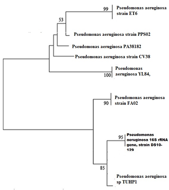 To confirm the identification of isolate TUHP1, 16S rDNA gene sequence analysis was performed. The sequence alignment using BLASTN software gave highest homology (99%) with Pseudomonas aeruginosa DS10 and was assigned with the strain name Pseudomonas aeruginosa sp TUHP1. A phylogenetic relationship was established through the alignment and cladistic analysis(Fig 4).