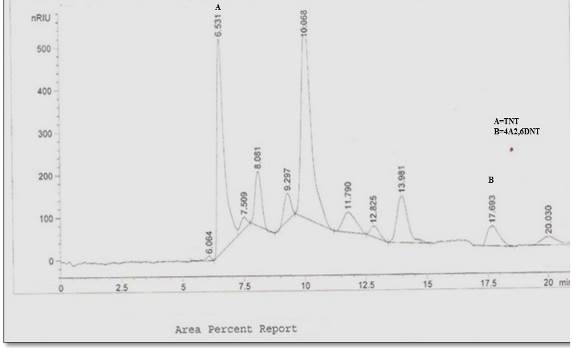 TNT derivates isolated from this reddish– brown-coloured supernatant were identified by GC-MS and HPLC analysis. 2HADNT and 4HADNT were detected by HPLC chromatogram (Fig 7). GC/MS analysis identified 2ADNT, 4ADNT as the metabolites from TNT(Fig 8).
