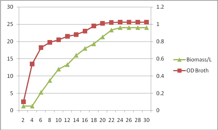 The potent Pseudomonas aeruginosa sp TUHP1 inoculated on production broth was subjected to growth curve analysis and biomass study. The readings were taken at an interval of 2h and were read at 610 nm using a colorimeter. The growth curves were plotted and the curves were used to determine the generation time, growth rate constant and mean generation time of the organism.