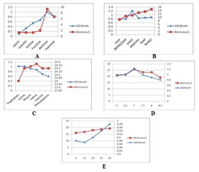 The optimisation parameters have been found to favor the multiplication of the cells. The maximum biomass was obtained at 27oC at the pH at 7 with the maximum utilization of dextrose as suitable carbon source and yeast extract as better nitrogen source (Fig 10).