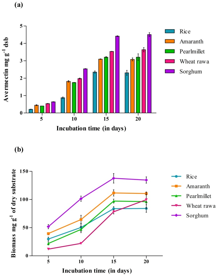 Fig. 1: Avermectin production and growth profile of S. avermitilis NRRL 8165on solid substrates. (a) Represent avermectin production, (b) Represent biomass accumulation of S. avermitilis NRRL 8165 on different solid substrates. Initial moisture content 100 %, inoculums level 20 % v/w, incubation temperature 28°C, incubation time 15 d. Values are the mean±standard error of 3 replicates