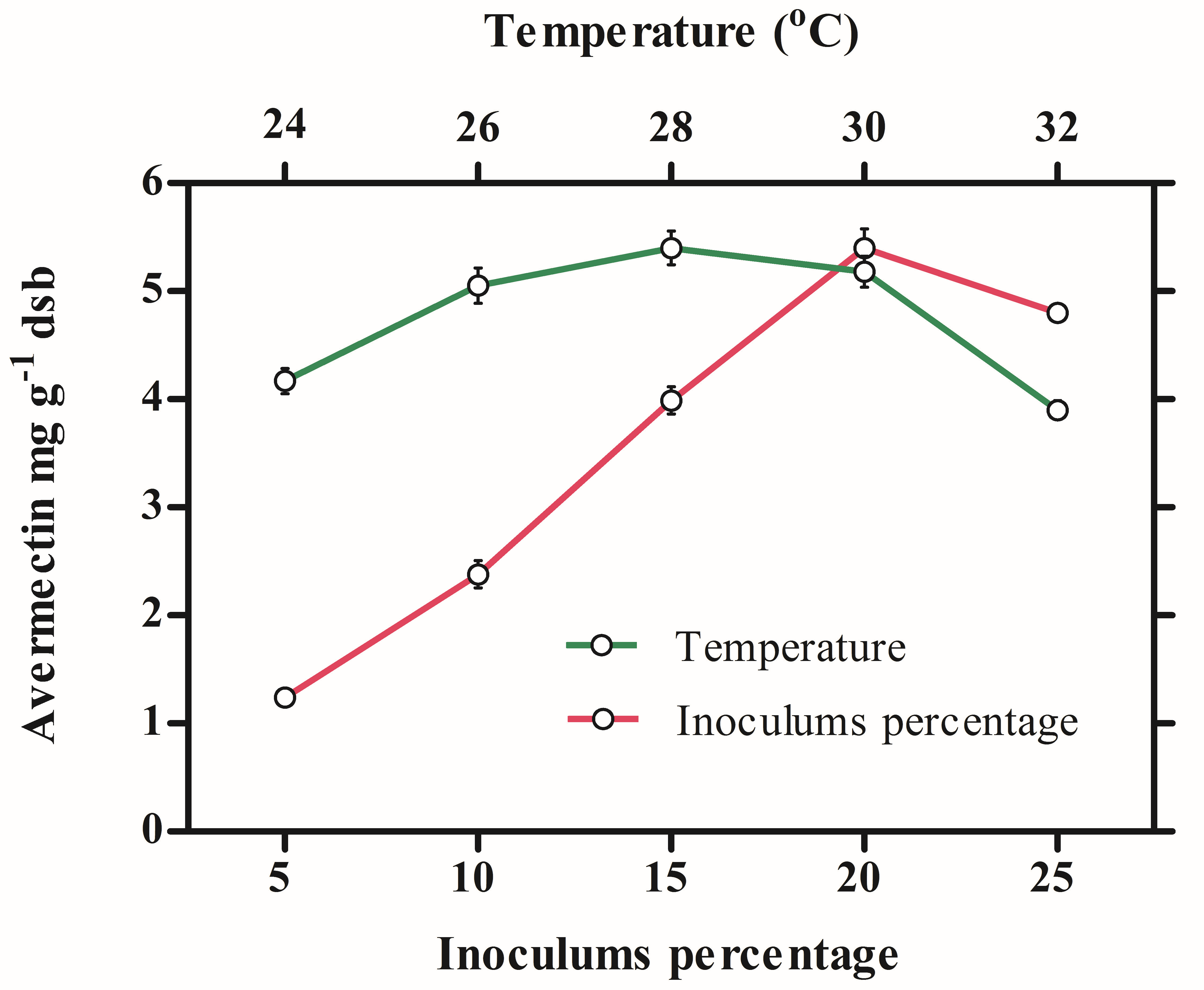 Fig.2:Avermecin production at selected inoculums level and temperature range by S. avermitilis NRRL 8165.Initial moisture content 100 %,incubationtime 15 d.Values are the mean±standard error of 3 replicates