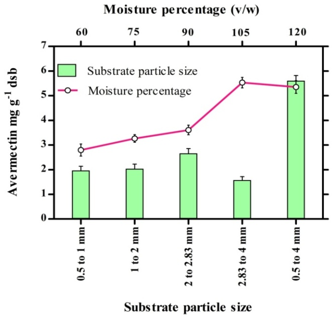 Fig.3:Avermectin production at selected substrate particle size and moisturelevels by S. avermitilis NRRL 8165. Inoculums level 20 % v/w, incubationtemperature 28°C, incubation time 15 d. Values are the mean±standard error of 3 replicates