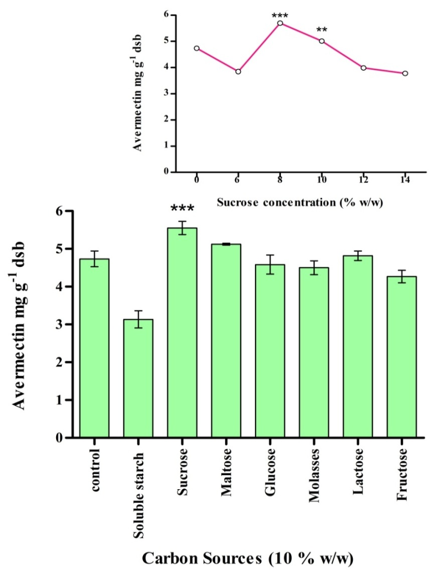 In solidsubstrate, some of the important nutrients necessary for growth and secondary metabolite synthesis for microorganism may also be present at sub-optimal level. Hence, theaddition of other nutrients may improve product formation in SSF processes. S. avermitilis NRRL 8165 can grow and produce avermectin on sorghum, but the organism may needed additional carbon source for maximum secondary metabolite synthesis. Different carbon sources were supplemented to solid substrate at 10 % (w/w). Results showed disaccharides supported, while monosaccharide’s decreased avermectin production (fig. 4). Readily available carbon sources like glucose, fructose and molasses were reported to work as a repressor for enzymes which are involved in the synthesis of secondary metabolites [21]. Asagbraet al. [31] also reported thestimulatory effect of disaccharides in secondary metabolism. In SSF environment organism suffer from osmotic stress and synthesized solutes responsible for osmoregulation called compatible solutes. Sucrose is used as one of the compounds to reduce osmotic stress. Elibol [32] reported sucrose might also act as an enzyme system inducer responsible for thesynthesis of a polyketide antibiotic actinorhodin produced by Streptomyces coelicular A3 (2). Yang and ling [33] also reported stimulatory effect of sucrose on tetracycline production with sweet potato residue by Streptomyces viridiciens ATCC 11989 under SSF. A similar observation was also reported in pikromycin production by Streptomyces venezuelae ATCC15439. An optimum concentration of sucrose (139 g l-1) was required for pikromycin production [34].