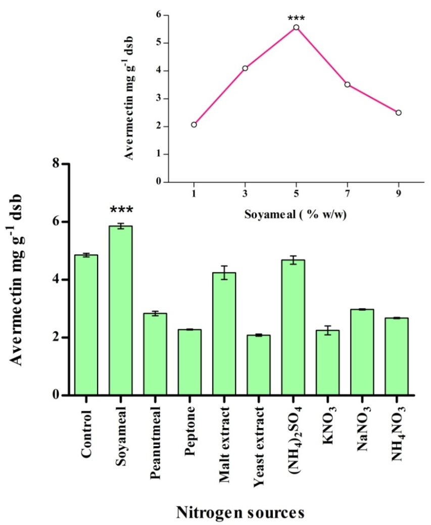 Fig.5: Screening of different nitrogen sources avermectin productionbyS. avermitilis NRRL 8165 on sorghum. Inset effect of different concentration of soyameal. * P<0.05; ** P<0.01; ***P<0.005 variable vs control (student’st test), organic nitrogen source - soya meal, peanut meal, peptone, malt extract and yeast extract at 5 % w/w, while inorganic nitrogen source -(NH4)2SO4, KNO3, NaNO3 and NH4NO3 at 0.5 % w/w