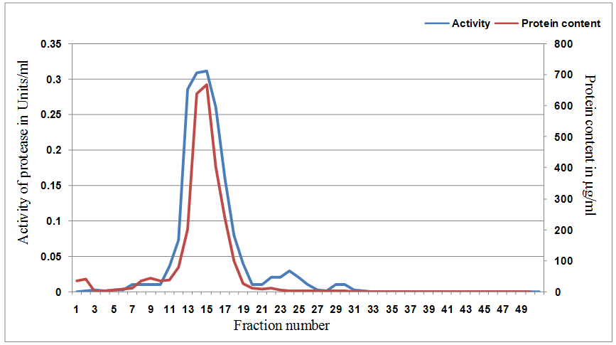 The data for yield and purification fold of protease inhibitor is presented in table 1. The fold of purification of protease inhibitor observed for ammonium sulphate precipitation and ion exchange chromatography were 1.1 and 2 respectively showing successive increase in specific inhibitor activity from 22 to 33 U/mg protein.