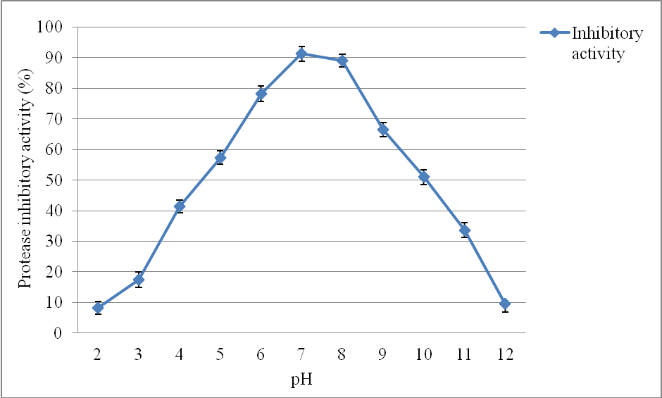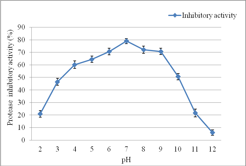 Fig. 3: Stability of protease inhibitor at different pH. The inhibitor incubated at different pH 2-12 for 24 h and assessed for the residual inhibitor activity at 37 °C with a pH 7. Values are presented as mean±SD of triplicates