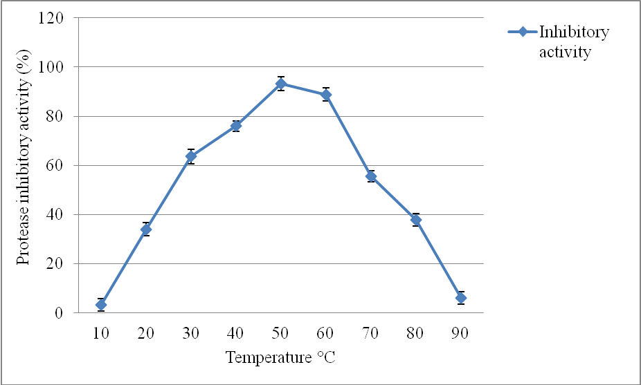 The maximal inhibitory activity of 67 % was shown for the inhibitor isolated from Moringa olifera leaves at pH 10.0 [21]. Thus pH affects the activity, structural stability and solubility of protease inhibitor.