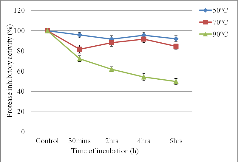 Temperature stability of purified protease inhibitor was evaluated by incubating 1.5 ml of inhibitor at different temperatures ranging from 30 °C-90 °C. The sample was drawn at different time intervals as 30 min, 2 h, 4 h, and 6 h and assessed for inhibitor activity.