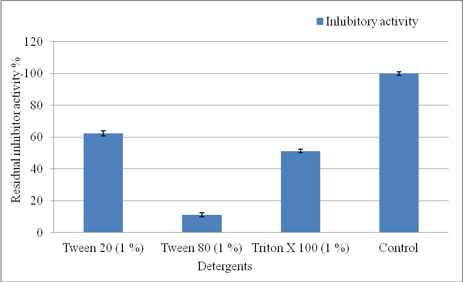 All non-ionic surfactants exhibited a negative effect on the protease inhibitor activity. In the presence of Tween 20 and Tritox-X-100, the protease inhibitor activity reduced to 85 % and 51 % respectively (when compared to the activity of control). The inhibitory activity considered as 100 % in the absence of surfactant. Preincubation with Tween 80 could inactivate the inhibitor with 90 % loss in inhibitor activity. Thus the inhibitor exhibited greater stability and activity in the presence of Tween 20 with 40 % loss in inhibitory activity.