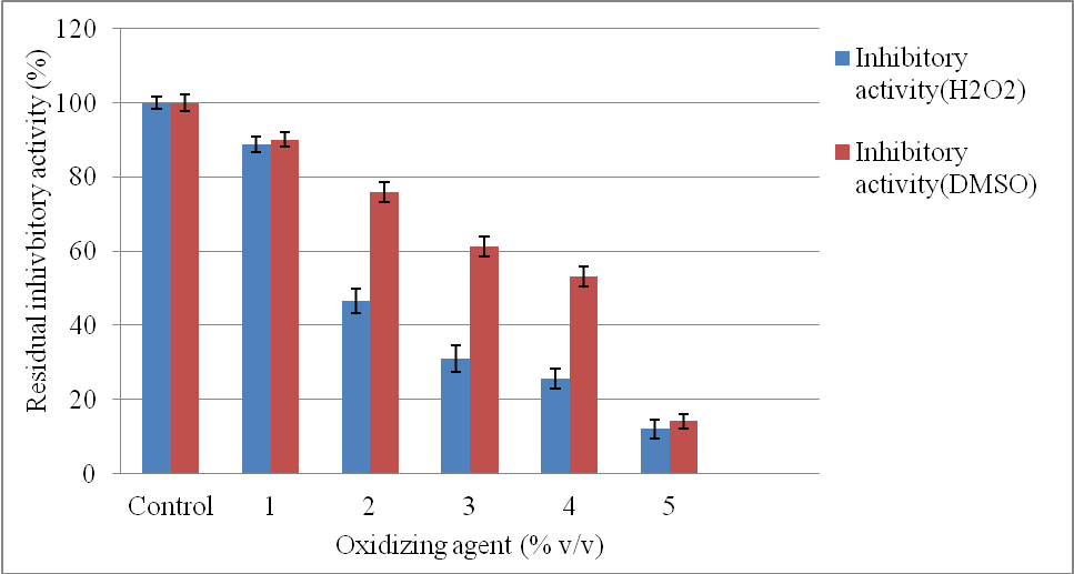 Fig. 7: Effect of oxidizing agents on protease inhibitor activity, Values are given as mean±SD of three sets of observations