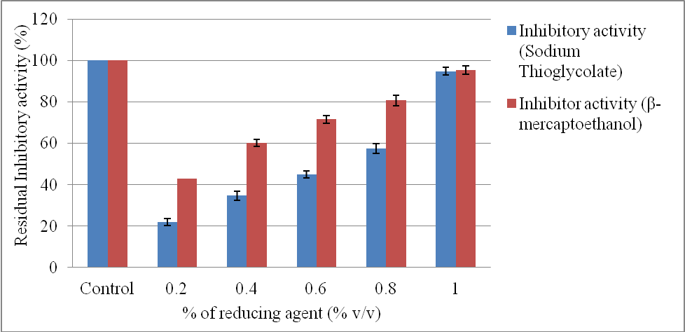 Reducing agents were observed to enhance the activity of protease inhibitor. The inhibitory activity was increased from 43 % to 93 % along with a corresponding increase in the concentration of β-mercaptoethanol from 0.2 % to 1 % respectively. In the same way, at 0.2 % and 1 % concentrations of sodium thioglycolate as an oxidizing agent, resulting inhibition was 22% and 95 % respectively.