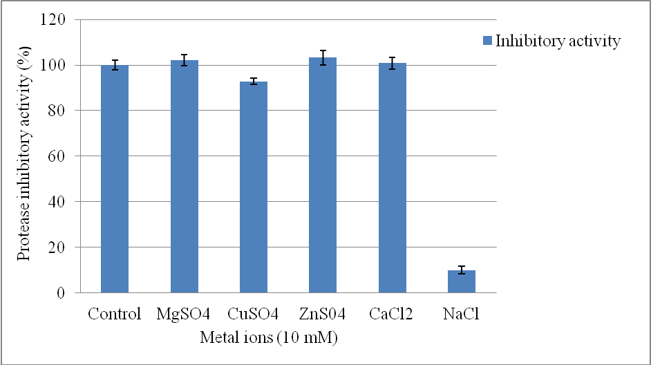 Effect of various metal ions on the activity of protease inhibitor was studied by using sodium chloride, calcium chloride, magnesium sulphate, cupric sulphate which contribute to metal ions Na+, Ca++, Mg++, and Cu++respectively. The inhibitor was added to 10 mmol concentration of metal ions and incubated further at 37 °C for 30 min. The protease inhibitor activity was measured using caseinolytic assay.