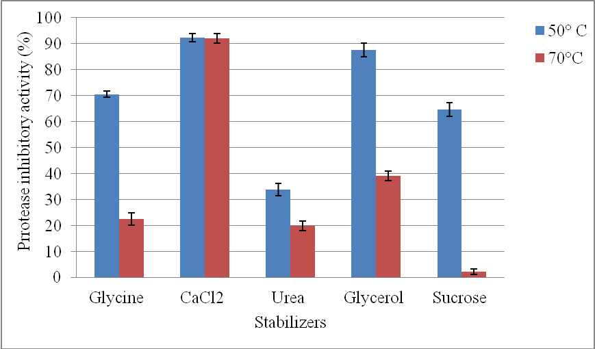 The effect of stabilizers on the thermal stability of protease inhibitor was evaluated by incubating the inhibitor in the presence of thermal stabilizers like glycine (1 M), CaCl2 (l0 mmol), glycerol (10 %), urea (l0 mmol), sucrose (1 %) at 50 °C and 70 °C for 3 h. At the end of incubation, the inhibitor was processed by regular assay procedure involving incubation along with trypsin and casein at 37 °C for 30 min to calculate residual inhibitor activity.