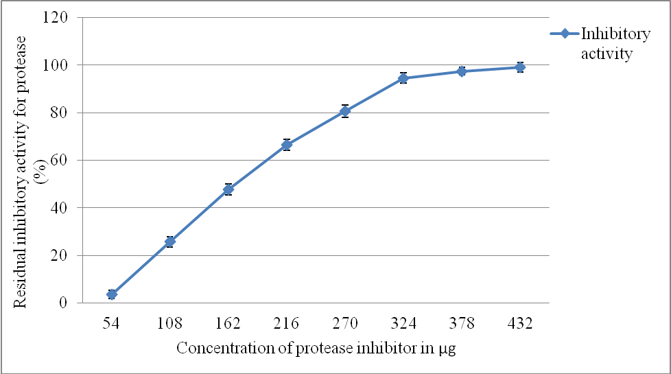 Protease-protease inhibitor interaction was studied and the data is presented in fig. 11. 100 % inhibition of protease corresponding to zero protease activity was observed at 432 μg inhibitor.