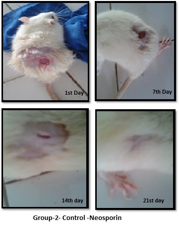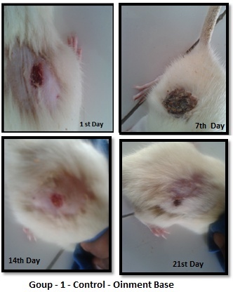 A circular wound of about 500 m2 was made by remove depilating the skin on dorsal thoracic region of rats under light ether anesthesia in aseptic condition and observed throughout the study. Animals were housed individually. All the test drugs were applied on the wounded area twice daily. Wound contraction was measured on 1st, 3rd, 7th, 14th and 21st post wounding days. % of wound contraction was calculated from the day of measurement of wound area.