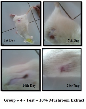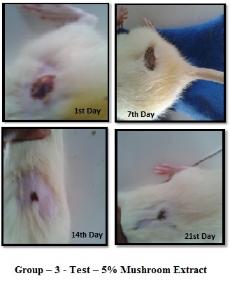 The Neosporin ointment showed significant (P<0.05) wound contraction from 3rd day onwards and on 7th, 14th and 21st day of % wound contraction was 42.27%, 75.26% and 92.24% respectively. The 5% mushroom extract showed 47.29% and 75.64% wound contraction on 14th and 21st days of the study respectively, the 10% mushroom extract showed 73.62% and 87.78% wound contraction on 14th and 21st days of the study respectively. Among the 5% and 10% mushroom extract, 10% mushroom extract showed good wound healing activity.