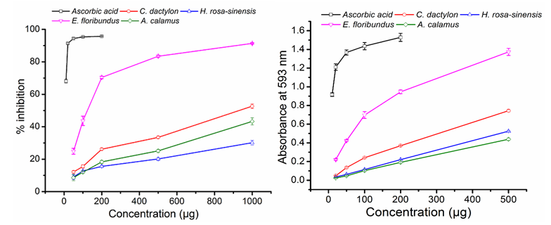 Fig. 1: DPPH activity of tested plants compared to (left) standard ascorbic acid and (right) increasing trend of FRAP activity with the increase of plant extract. All values are significantly different at P<0.05 compared to standard ascorbic acid