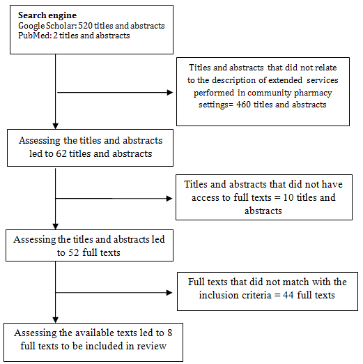 A systematic search of international literature review and studies wasundertaken using Google Scholar and PubMed as an electronic database, searching for abstracts in English from January 2006 till May 2017. The search terms used were: Malaysia; community pharmacist; extended roles; extended services; expansion roles; expansion services; perception; perspective; attitudes; barriers; limitation. The abstracts wereevaluated by a researcher, searching for relevant materials that fitted with the inclusion criteria as depicted in table 1. The abstracts that adhered to the inclusion criteria were assessed for full texts. Then two researchers assessed in detail the contents of eachtext, searching for materials thatfulfil the criteria as depicted in table 1. These full texts werereflected inthe present review.