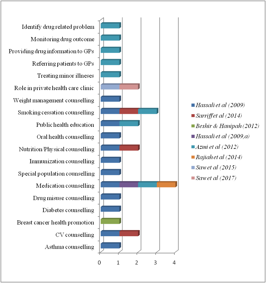 A total ofnineteen actual or potential extended serviceswere noted in thereview (see table 3).Medicationcounselling [6-8,10] and conducting smoking cessationprogram [6,8,11] were the most rated extended services. Surprisingly, it was found that CPs were noted theless paying attention to identify, prevent and resolve drug-related problem [8]. It was also noted that CPs were referring their customers to GPs [8] even though it was previously noted that the practice itself was more towards business-oriented practice. In addition, CPs were also noted to counsel their customers about major diseases such as asthma, diabetes and cardiovascular [6,11], crossing over the age-old role as a medication dispenser.