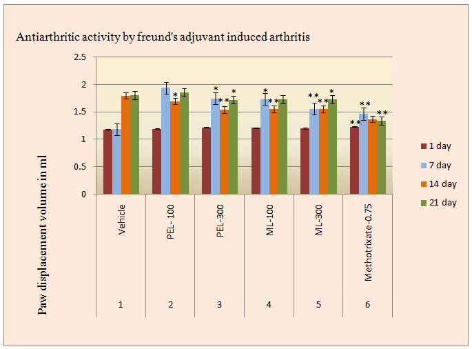 Table 1: Secondary lesions observed due to effect of Petroleum ether and Methanol extract of leaf of Pergularia daemia [Forsk] as anti-arthritic activity by Freund's adjuvant induced arthritis.