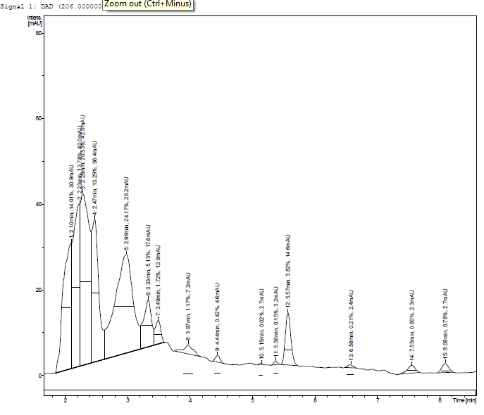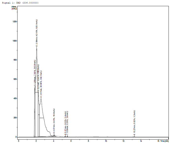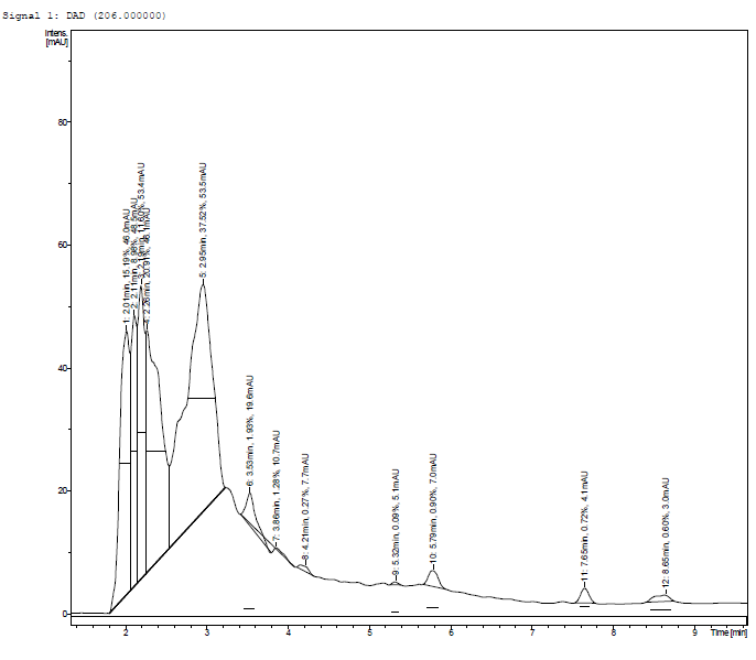 A Linear gradient of acetonitrile: water (4:6 to 6:4) over 30 min was used and the mixture was degassed and filtered [19]. The flow rate was maintained at 1 ml per minute. The detection was done in UV at 200-400 nm.