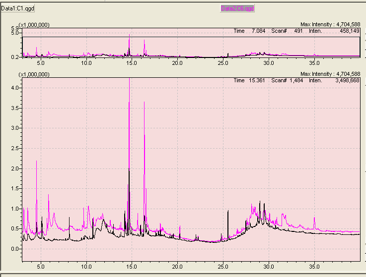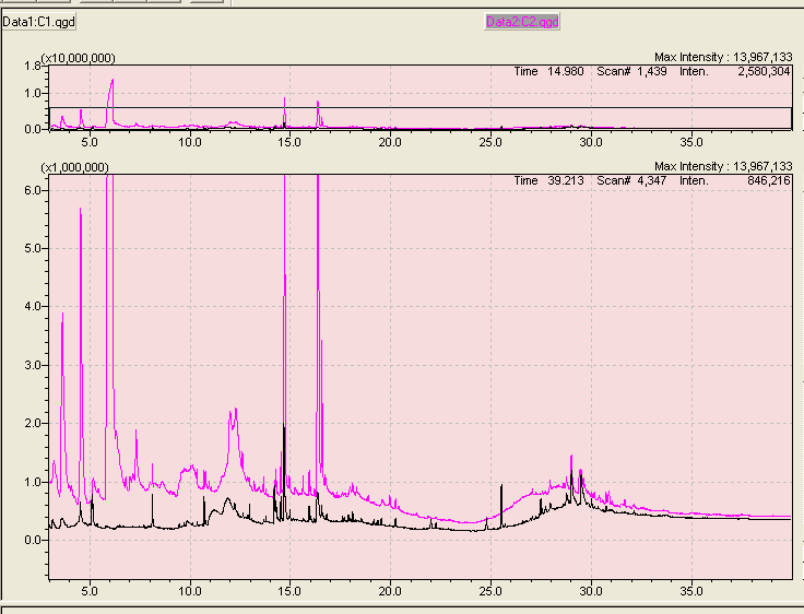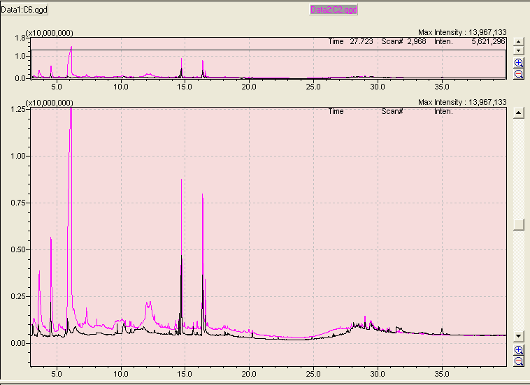 Fig. 16: An overlap chromatogram of GC of callus and nature grown roots, C6(Black) = callus, C2 (Pink) = Nature grown roots