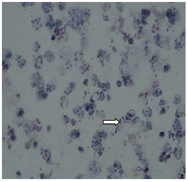 Preparation of antigenIn most of the vaccination studies, the soluble material, which is a small representative subset of the total parasite antigens, was found as potent immunogen as the intact IE [18]. Brief procedure of antigen preparation is as follows. First, 2 donor mice were prepared by injecting with a counted inoculums of 1 x 106 IE. On day 4, the mouse with 2–5% parasitemia was used to infect a batch of 15 healthy mice conditioned with 12 h light-dark cycle. Briefly [18], when donor mice had > 80 % parasitemia, the maximum number of schizonts, they were bled in pre-chilled citrate saline. The blood-citrate mixture was then kept overnight at 4°C which results in the formation of different layers and infected erythrocytes and normal erythrocytes layers become visible. Upper infected erythrocytes layer (schizonts rich layer) was aspirated using a sterile Pasteur pipette in a sterile centrifuge tube and centrifuged at 3000 g for 15 min at 4°C. They were washed thrice with chilled DMEM. Smear slides were prepared and parasitemia was checked. When 90% schizonts and very few rings were seen, the pelleted IEs were lysed by the rapid cycle of freezing and thawing. Figure 1 clearly shows the lysis of IEs (arrow marked). The crude cell lysate was centrifuged, and clear supernatant was decanted. Protein estimation for this supernatant was done using the Bradford method (Biorad Protein Estimation Kit) and its concentration was adjusted to 2.1 mg/ml. The antigen-based vaccine was stored as aliquots of 100 µl at -70°C. The same antigen preparation was used in all the experiments. And similarly NEA was prepared using blood of normal mice.