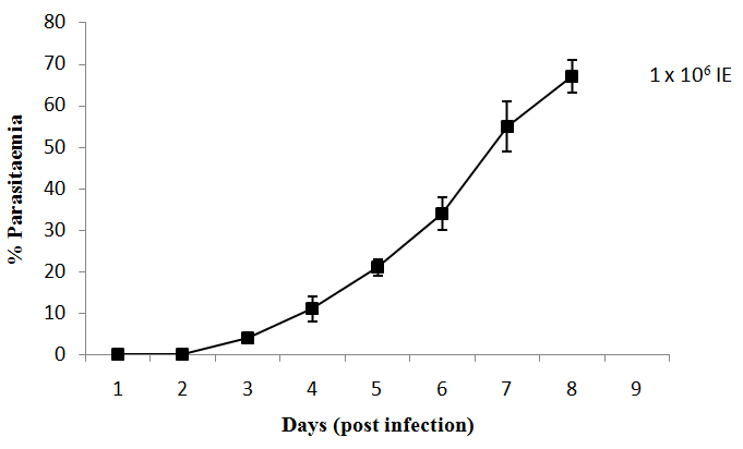Pyn-MDR is a highly virulent strain causing 100% fatality in Swiss mice. The course of infection was studied by infecting i. p. in a group of mice (n=5), with inoculums of 1 x 106 IE respectively (Fig. 3). The percent parasitemia rose from day 2 to day 8. Mice became patent on day 2 and displayed a maximum parasitemia of 69.56 ± 2.22% on day +8. All mice succumbed to the fulminating infection by day +9.