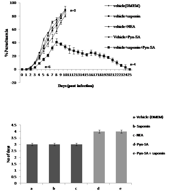 Fig 4: (a) Challenge results of mice vaccinated with saponin as an adjuvant. Mice (6/experimental group; 6/control groups) were vaccinated, s. c. and i. v. by administering/mouse a. DMEM (0.5 ml as vehicle), b. saponin (50 μg), c. NEA (50 μg), d. Pyn-SA (50 μg), e. vaccine (Pyn-SA + saponin; 50 μg each), on days 0, 15 and 30. All the mice in each group were randomly challenged, i. p., with 1x103 IE/mouse on day 45 after first vaccine shot (day 0 in figure). Percent parasitemia was determined daily by microscopic examination of the Wright’s stained thin tail-blood films. The data are mean ± SD, n = number of mice. (b) Comparison of pre-patent periods of different groups of immunization