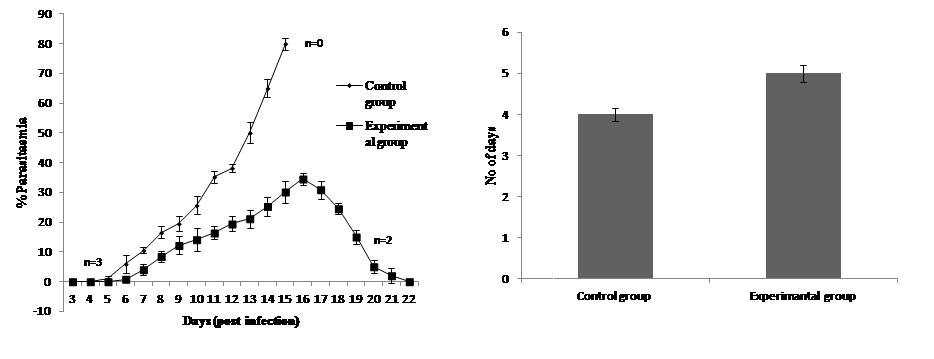 Statistical analysisValues are expressed as mean ± S. E. M. in percentage was calculated as: 100-[(mean % parasitemia treated/ control) X 100]. For comparison of mean of different groups one way ANOVA and Student’s t- test was used. All the statistical calculations were made on the Sigma Stat 3.5. A value of p < 0.05 was considered significant.