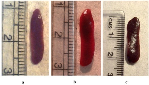 Determination of Splenic parametersWhen mice are completely immune to infection then there spleen were removed, its size, weight and shape were determined (Fig. 6) (Table 3). There is the clear difference between spleen of immunized, normal and infected mice spleen. As malaria parasite destroys RBCs that are usually removed from circulation by spleen therefore weight of the spleen is expected to be increased in plasmodium infected mice but in case of malaria immunized mice parasitemia was decreased so the size of the spleen comparable to size of normal mice spleen.