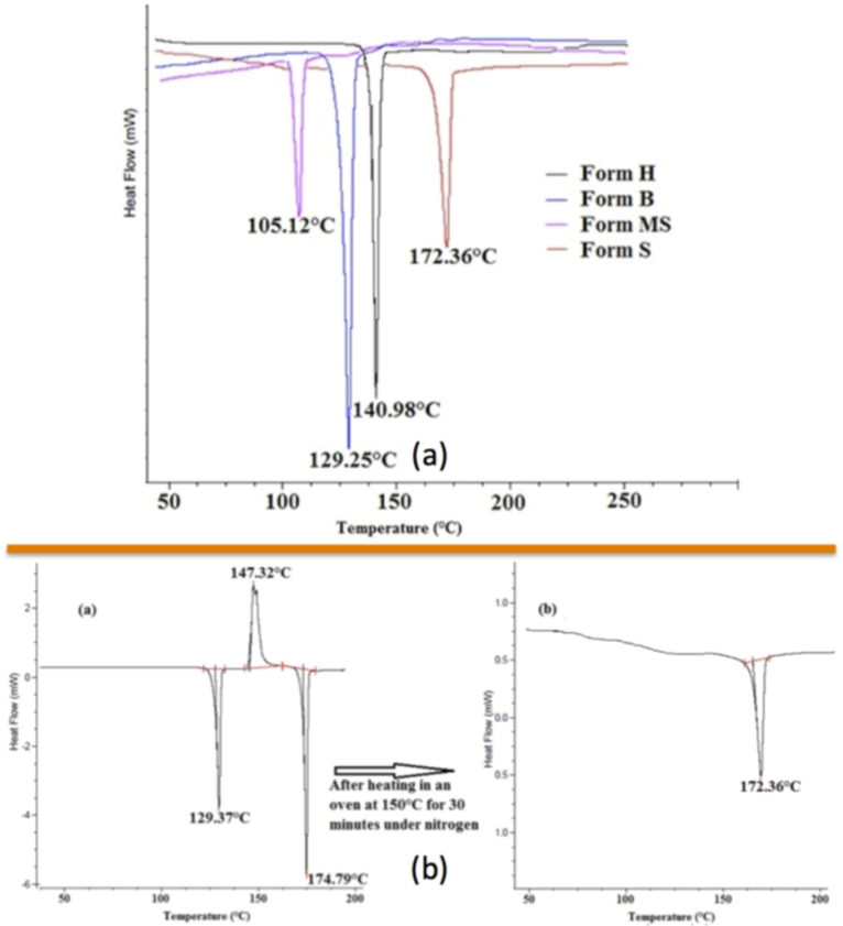 DSC pattern of a form produced from recrystallization of commercial sample (form H, melting endotherm at 140.98 °C, enthalpy of fusion: 53.88 J/g) from ethyl acetate, dioxane: heptane (1:1), dioxane: hexane (1:1), dioxane: cyclohexane (1:1), showed the appearance of single sharp melting endothermic peak at 129.25 °C (enthalpy of fusion: 23.75 J/g) as shown in fig. 1(a)). The position of the melting endotherm suggested it to be Form B, which has already been reported in theliterature. However, these authors have used different solvents to prepare Form B [8, 29].