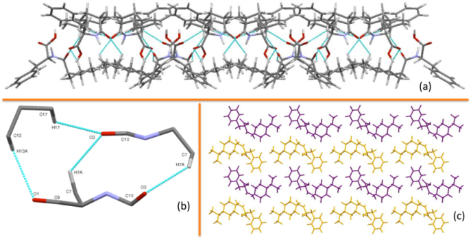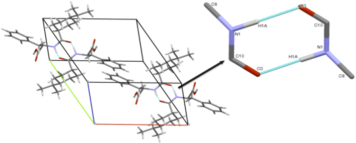 The primary objective of this study was to explore the structural aspects of nateglinde polymorphs. To achieve this, the crystal structures of these crystalline polymorphs were determined using PXRD by BIOVIA Material Studio software. Form H was found to exist in triclinic crystal system, (P-1 space group), which is in concordance with the results reported by Gang et al. [16]. However, the cell parameters are not same. The reason for this may be attributed to the difference in the indexing algorithm. Moreover, they have not described the space group and the packing arrangement. Form H consists of two molecules in the unit cell (fig. 3). Homomeric synthon between-NH and-CO of anamide group (N1-H1…O3) of different molecules is formed. It appears as a dimer (amide-amide dimer), showing hydrogen bonded wavy arrangement of molecules along c axis in the crystal lattice lying parallel to one another.