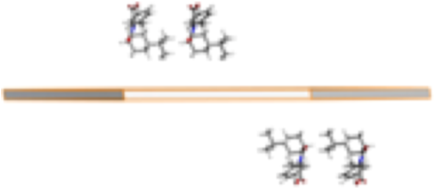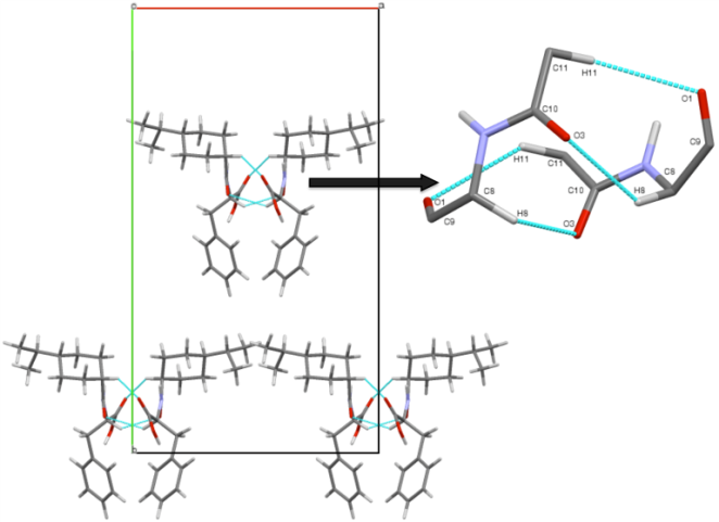 The structural aspects of From B and MS have not been explored till date. Form B exists in monoclinic crystal system with C2 space group (fig. 5). Nateglinide molecule is present in in L-shaped conformation forming two homomeric synthons. One homosynthon (O3…H8-C8) is formed between–CO of amide group and methine–CH (attached to carboxylic group) of different molecules. The other homosynthon formed (O1…H11-C11), shows the hydrogen bonding between CO of carboxylic group and–CH of cyclohexyl ring. The packing arrangement is in such a fashion that the benzene ring (head) of two center molecules faces each other whereas the cyclic ring and hydrocarbon chain (tail) are opposite to each other. Other two molecules are present at the corners, with the head emerging out of the unit cell while the tail is approaching each other in the unit cell.