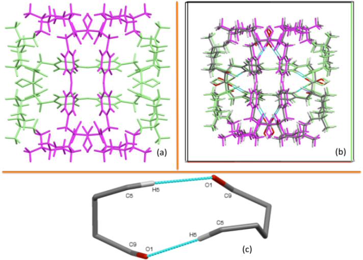 Fig.6: Form MS (a) sandwiched bilayer along a axis, (b) homomeric synthon, (c) top view along c axis