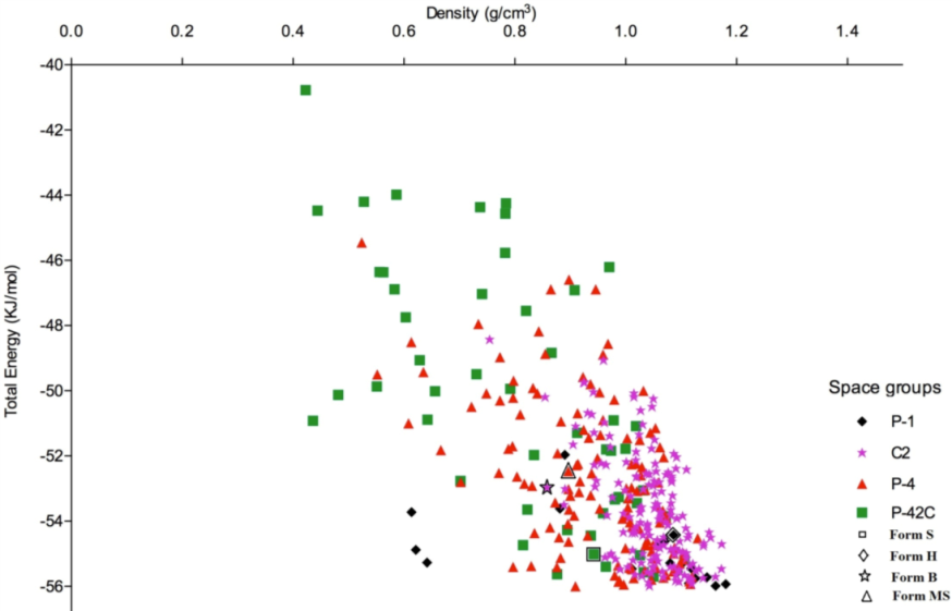 Indexing of the powder diffraction pattern of experimentally prepared polymorphs (Form H, B, MS and S) revealed that the forms exists in P-1, C2, P-4 and P-42C, respectively, therefore, the possible crystal structures were explored in these space groups using Polymorph Predictor, employing COMPASS force field.