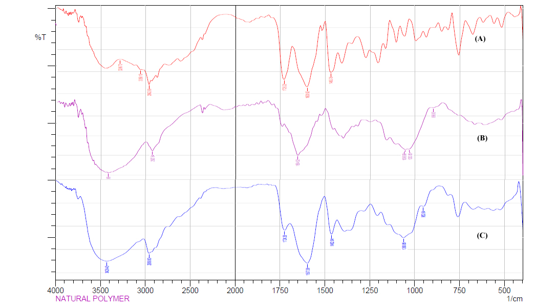 Fig.1: FTIR spectrum of (A) Valsartan (B) OBM (C) valsartan+polymer mixture