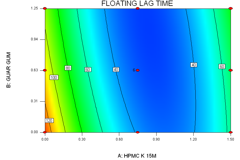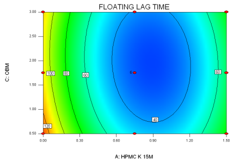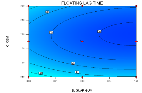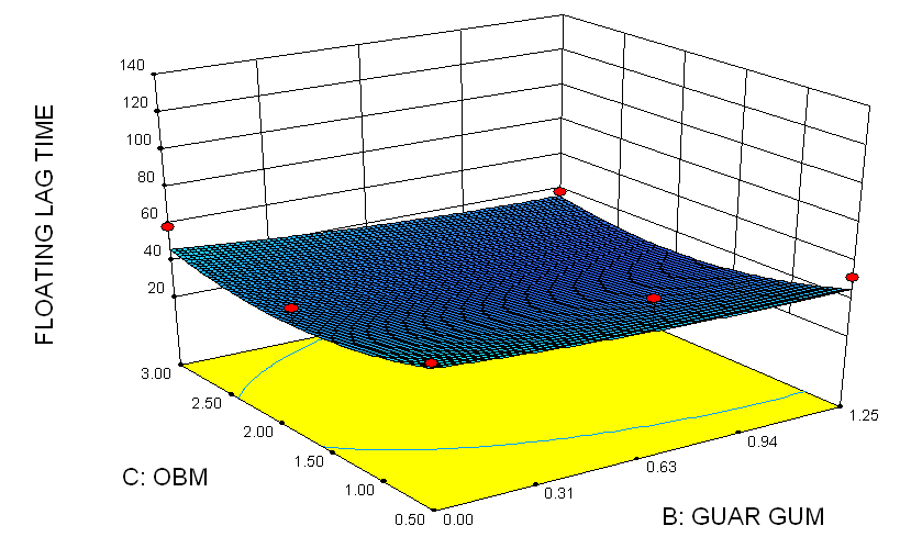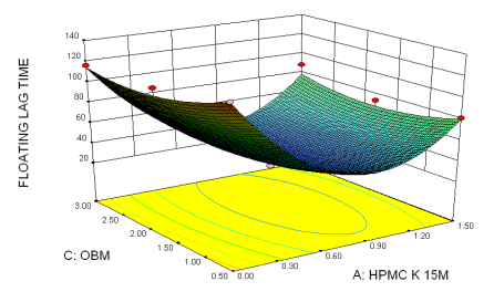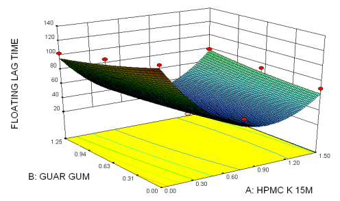 Equation(2) prooved that floating lag time decreaseswith an increase in amount of factor A,factor Band factor C. This was due to high swelling property of the polymers. Similar result was found in gastro retentive matrix tablets of ziprasidone hydrochloride containig HPMC K4M by Sateesha et al.[34]. Combined effect of A* B and A* C were positive but B* Cwas negative on floating lag time which was exhibited by contour plot and 3Dresponse surface plots (fig. 2).
