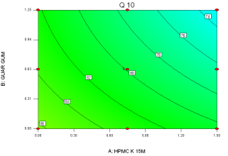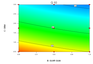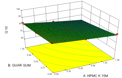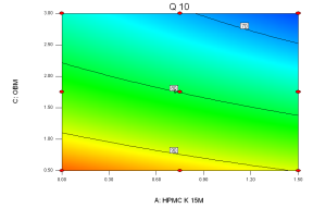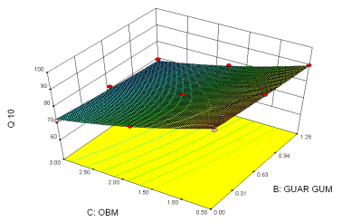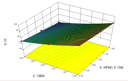 Equation (3) prooved that drug release rate appeared to decrease with an increase in amounts offactors A, B, and C. This is in agreement with the literature provided by Rajani et al. [35]. The combined effect of A*B, A*C are negative but B*C is positive on drug release at 10 h was exhibited by contour plot and 3D response surface plots (fig. 3).
