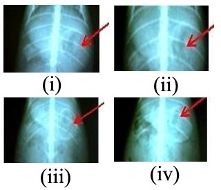 Fig.4: X-ray radiograms showing presence of VFIG in gastric region of rabbit at i) 0 h, ii) 0.5 h,iii) 2 h, iv) 8 h respectively
