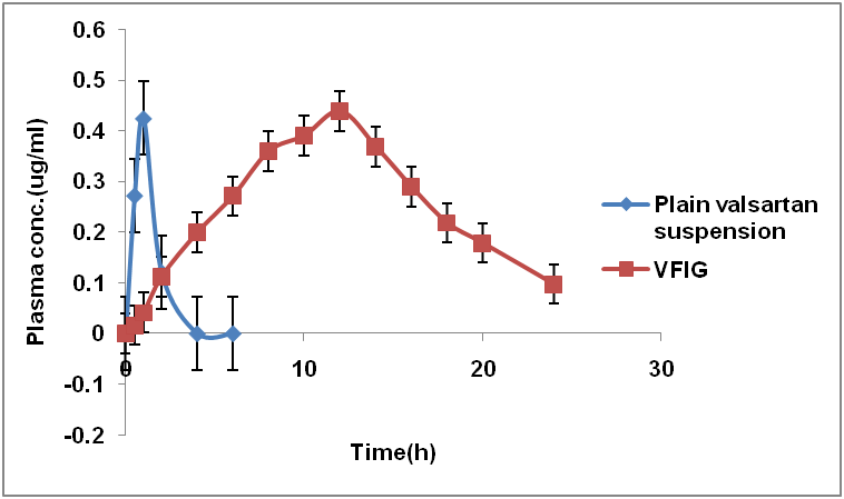 Fig.6: Plasma concentration time profile of plain valsartan suspension and VFIG(n=6, mean±SD)