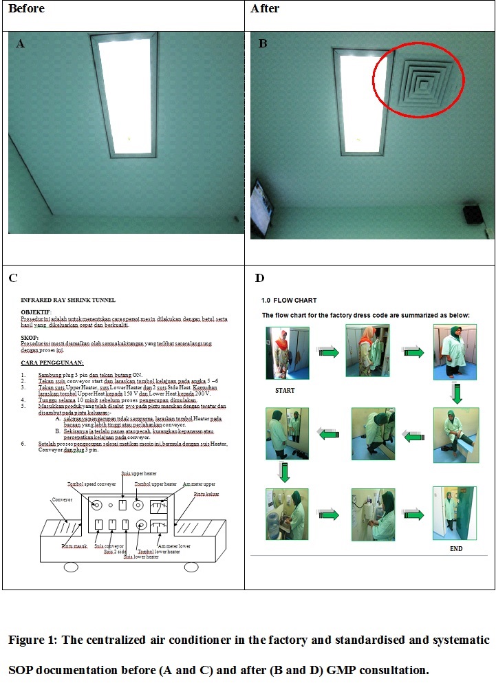 There were two majors improvisation made by the company after the training which was the ventilation system and documentation. Before the training was done, the company used a separated air conditioner in the building (fig. 1: A). The split units of the horizontal air conditioner can easily collect dust on the surface and constant cleaning is essential. During the cleaning process, dust may be distributed throughout the area and can affect the products’ hygiene. After the training, a centralized air conditioner was installed (fig. 1: B). The system connects to all process and production area vertically through the ceiling while its compressor and air filter are placed outside the building.