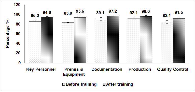 An increase of 14.4% in question five showed that the employees understood that employees from production department are restricted to enter the quality control department (66.7% vs 81.1%). Whereas, 84.4% (after training) employees agreed that heavy metal test should be conducted on the final products manufactured compared to 75.9% (before training).