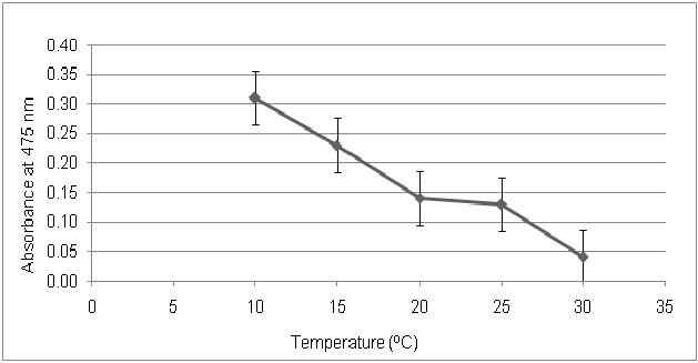 The extracted pigment from Kocuria sp. BRI 36 was dissolved in PBS at aconcentration of 5mg/ml. spectrophotometric analysis showed 475 nm as its λmax. Previous reports on different species of Kocuria have also shown maximum absorbance of carotenoid pigment in the range of 471-477nm [15].
